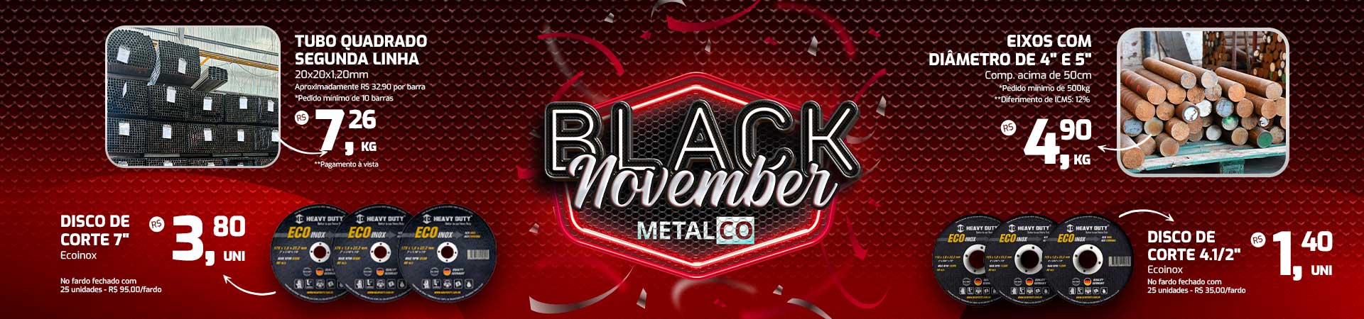 Aproveite os descontos da Black November MetalCo! Tubos quadrados 20x20x1mm, eixos de 4″ e 5″, discos de corte Ecoinox de 7″ e 4.1/2″ com preços especiais. Estoque limitado, garanta já o seu!